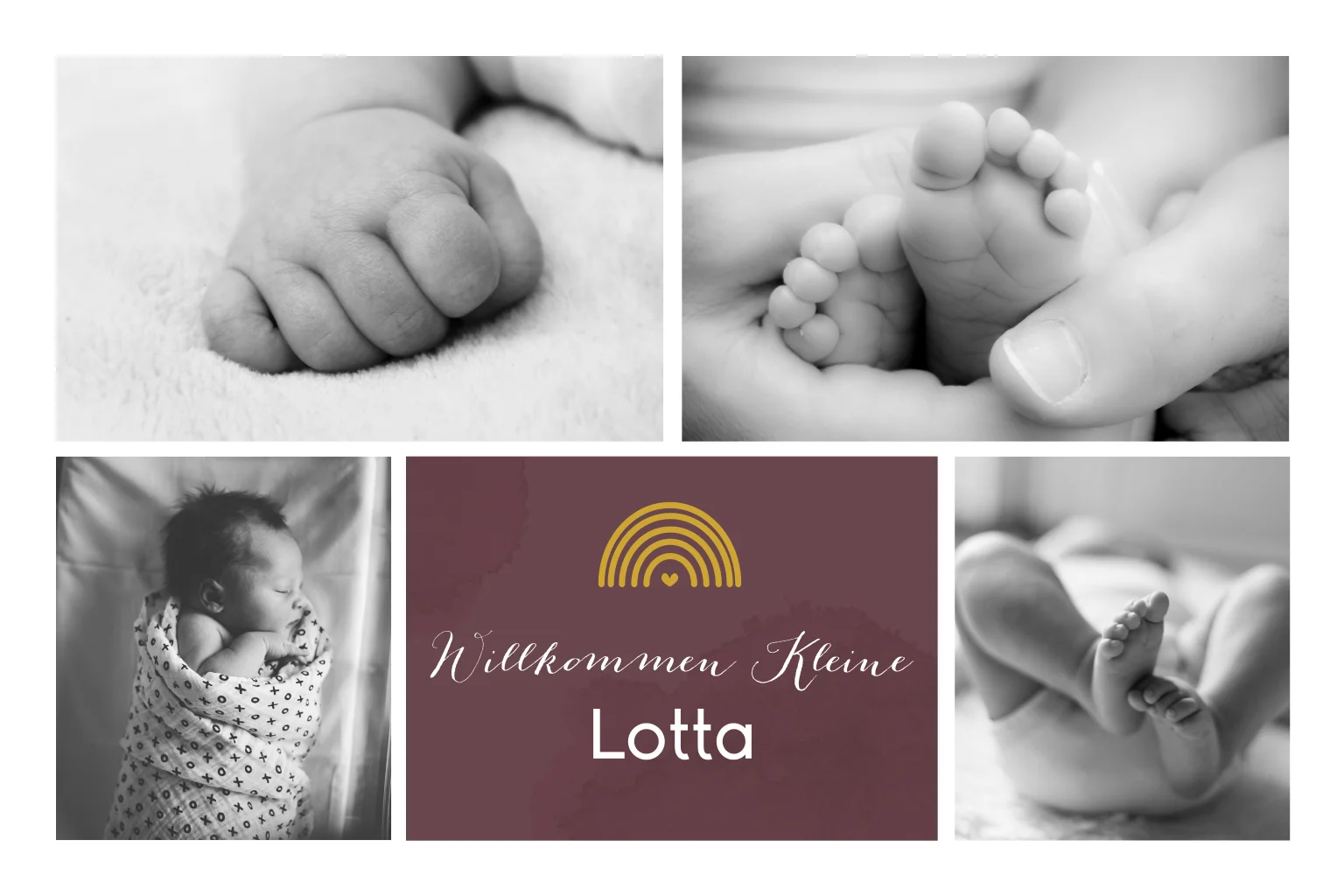 Babykarte mit Fotos, Regenbogen und Herz.Auf der Suche nach mehr Inspiration? Sieh dir gerne auch unsere anderen Dankeskarten zur Geburt an.
