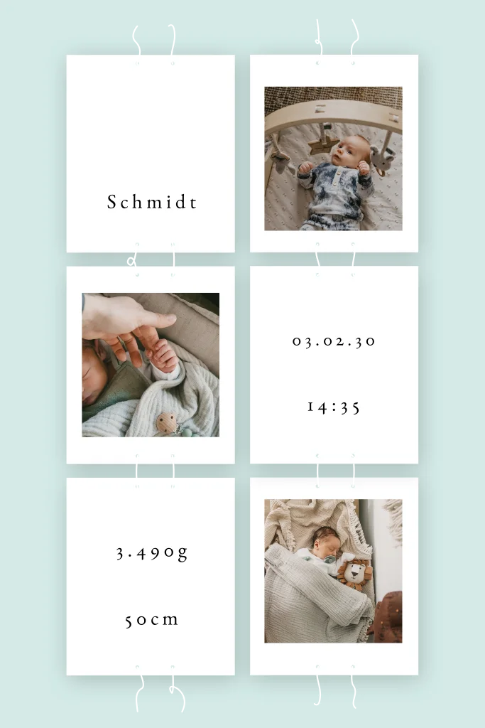 Auf der Vorderseite kannst du alle wichtigen Geburtsinfos, wie Babyname, Geburtsdatum, Größe und Gewicht notieren. Dazu hast du auch noch Platz für mehrere deiner Liebslingsbilder. Auf der Rückseit kannst du noch mehr Bilder einfügen.