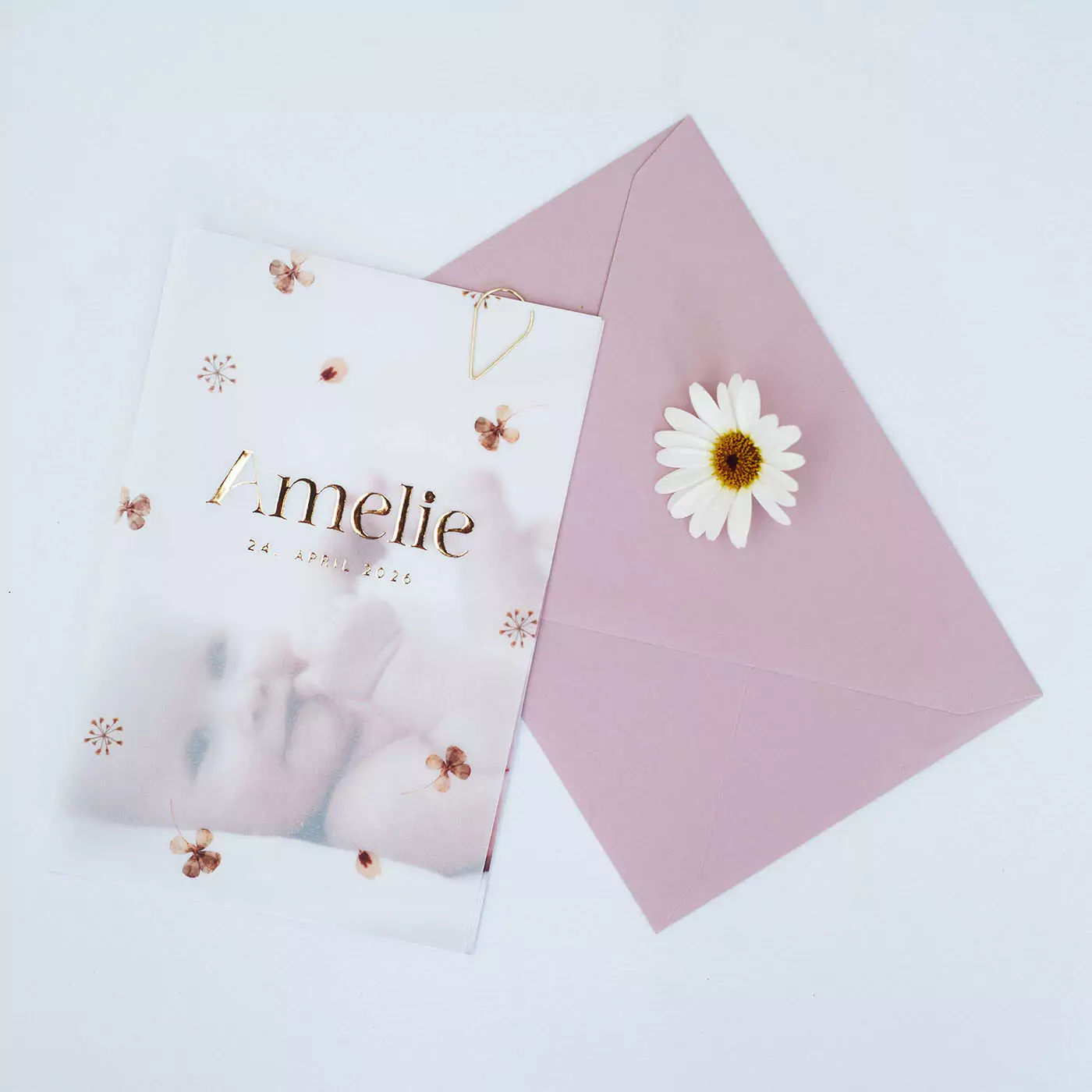 Bestelle zu dieser Karte auch das passende Deckblatt. Dieses Deckblatt ist aus dünnem Transparentpapier hergestellt (150 g/m²). Vergewissere dich, dass dein Deckblatt die gleiche Größe hat wie deine Hochzeitskarte.Die Karten werden mit einer Büroklammer zusammengehalten. Wähle aus, welche Büroklammer deiner Meinung nach am besten passt.