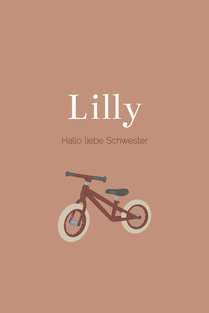Die Geburtskarte ist im einfachen Hochformat gehalten und hat runde Ecken. Auf der Vorderseite ist ein Kinderfahrrad abgebildet, darüber stehen der Name des Neugeborenen und die Worte "Hallo liebe Schwester". Die Rückseite enthält alle wichtigen Geburtsinformationen sowie ein Foto des Babys.Melde dich für unseren Newsletter an und profitiere von exklusiven Angeboten, kreativen Ideen und Neuigkeiten aus unserer Produktwelt. Als Dankeschön für deine Anmeldung schenken wir dir einen kostenlosen Probedruck deiner Karte.