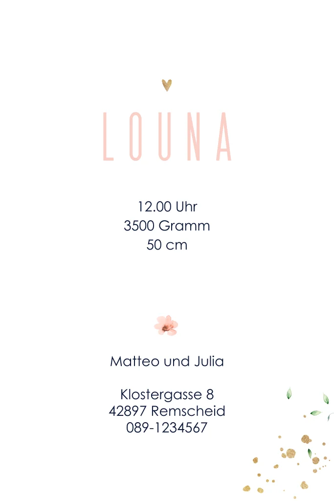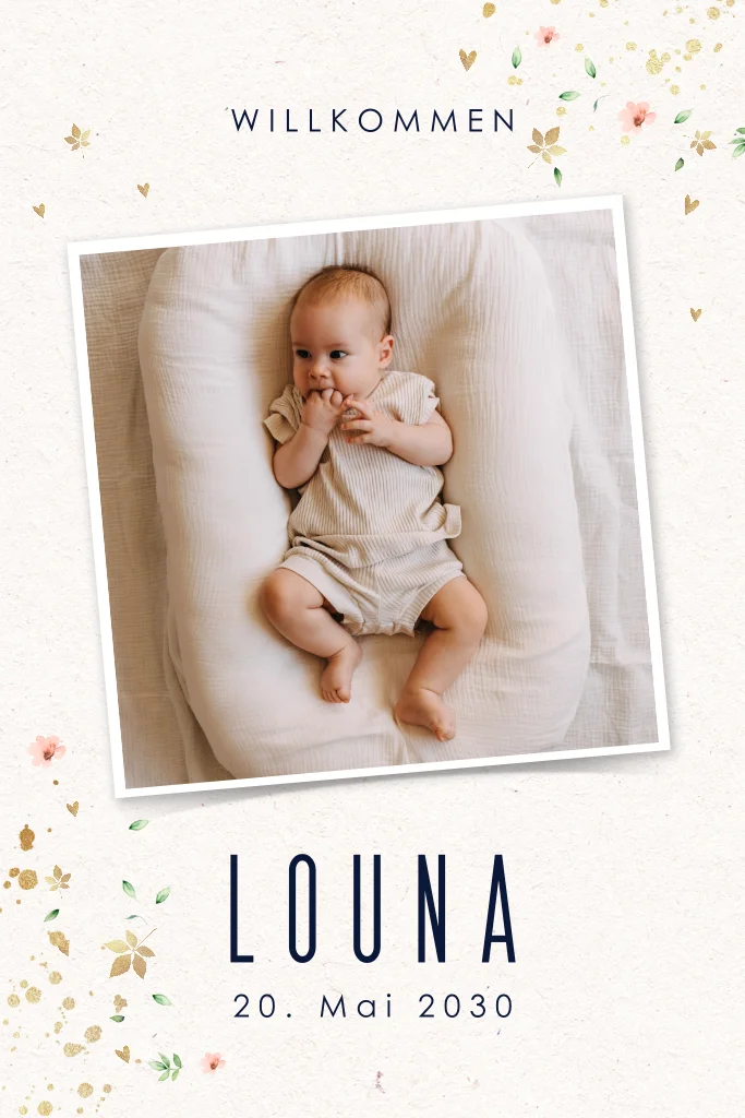 Hübsche Geburtsankündigungskarte mit Foto und Blümchen