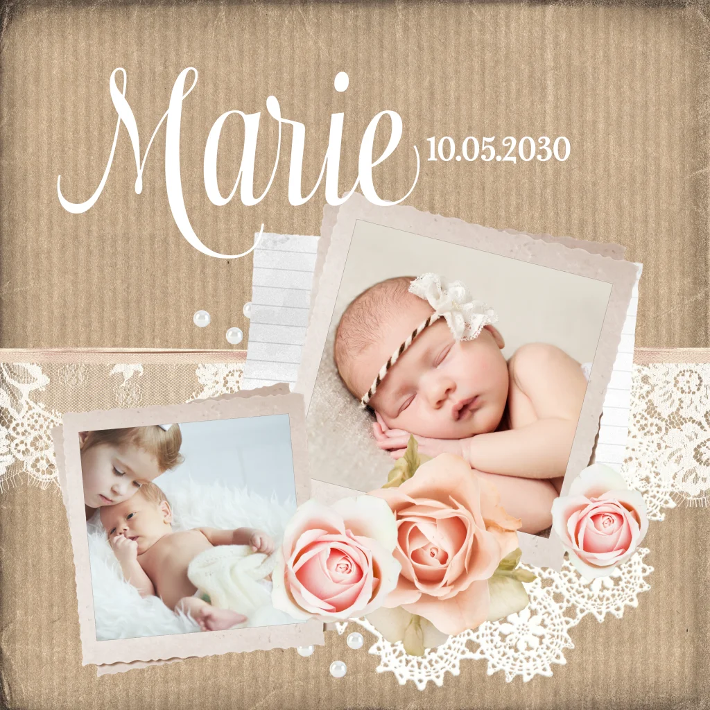 Suchen Sie eine romantische Karte? Ganz besonders bezaubernd sind der Kraft-Hintergrund, die rosa Blüten und die Spitze. Die Fotos Ihres Babys haben auch einen schönen Platz auf der Vorderseite der Karte.