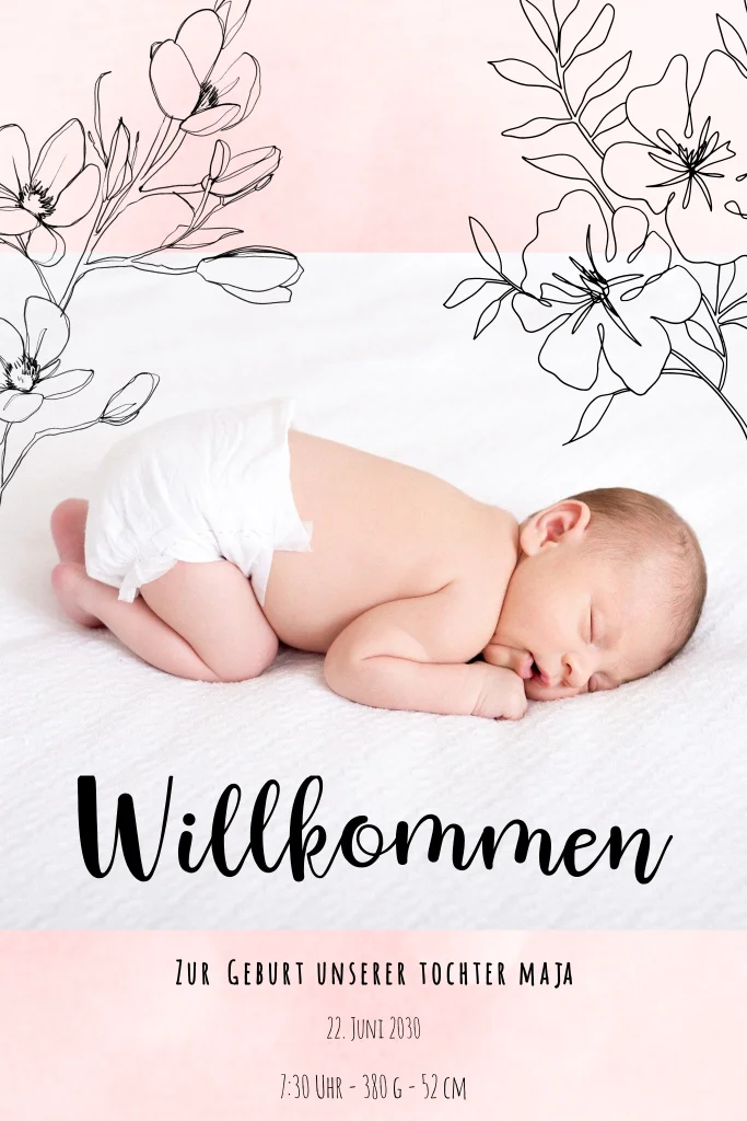 Rosa Geburtskarte mit feinen Blütenmotiven