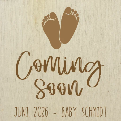 Hölzerne Weihnachtskugel mit Babyfüsschen als Schwangerschaft verkünden.