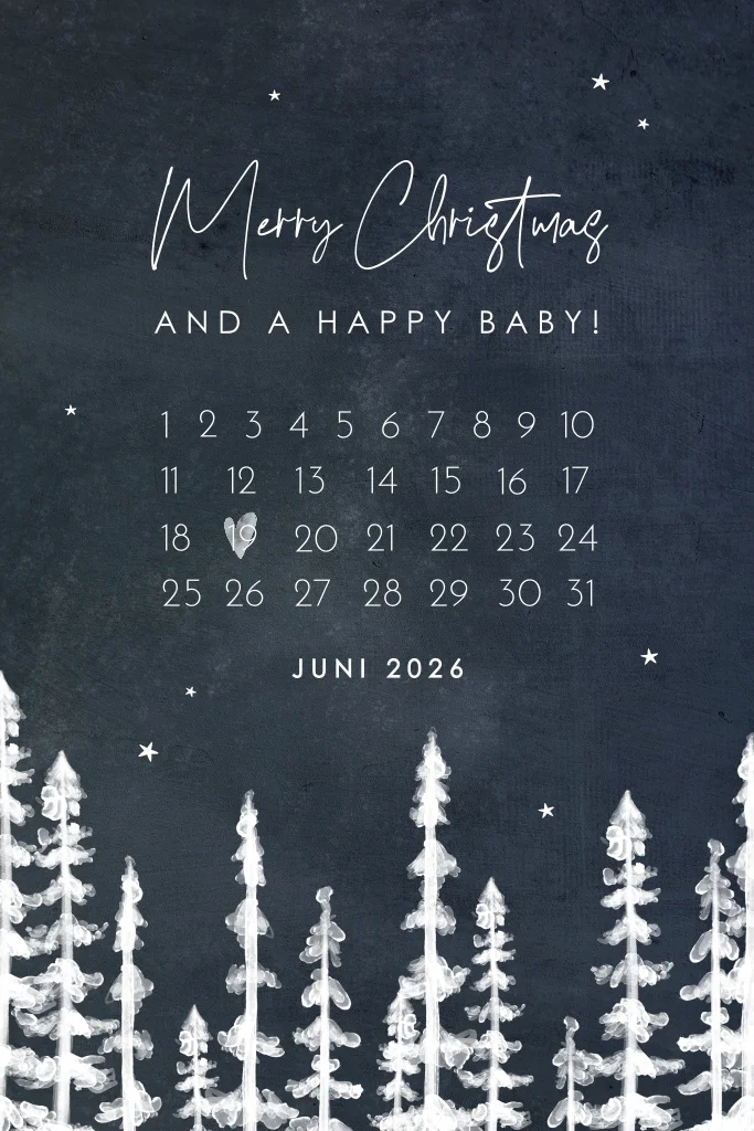 Du bist schwanger und möchtest es am liebsten direkt allen erzählen, aber willst noch bis zur 12. Schwangerschaftswoche warten? Vielleicht passt das ja perfekt, um deine Schwangerschaft an Weihnachten zu verkünden und Eltern, Oma und Opa und allen Freunden und Verwandten die tolle Nachricht deiner Schwangerschaft zu verkünden. Überrascht eure Familie dieses Weihnachten mit eurem größten Geschenk und dieser tollen Wrihnachtskarte mit Kalender.