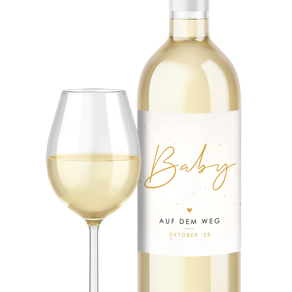 Weinetikett als Schwangerschaftsankündigung mit 'Baby auf dem Weg'