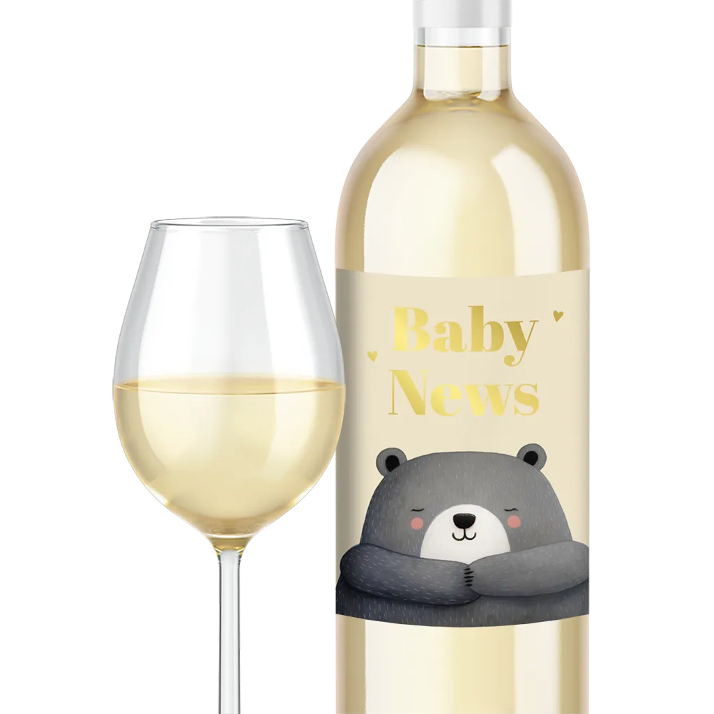Weinlabel mit Schwangerschaftsankündigung und süßem Bären Motiv