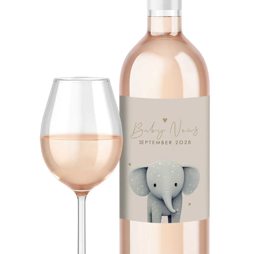 Weinlabel mit süßem Babyelefanten als Schwangerschaftsverkündung