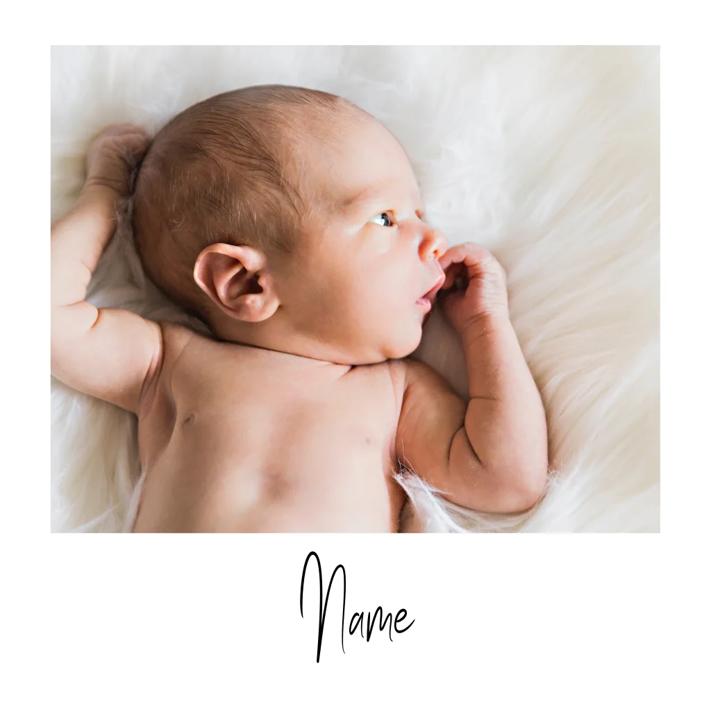 Diese Geburtskarte zeigt Ihr Baby in einem ansprechenden, an Polaroidfotos angelehnten Layout. Der Name Ihres Kindes in handschriftlich wirkender Schreibweise schmückt die Vorderseite; für ein persönliches Dankeschön und die Geburtsdaten Ihres Kindes findet sich auf den Innenseiten der Karte Platz.