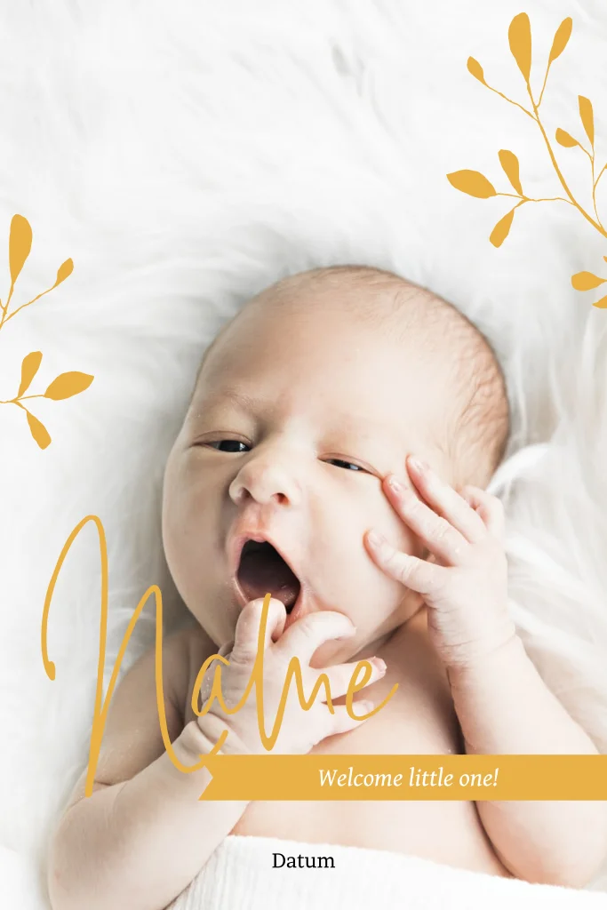 Fröhliche Babykarte mit Foto, Zweigen und gelben Farbflächen