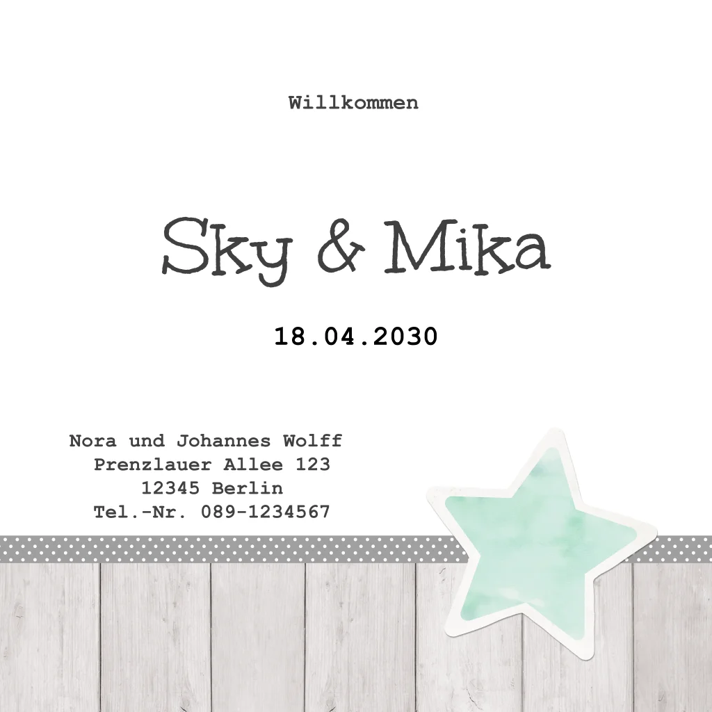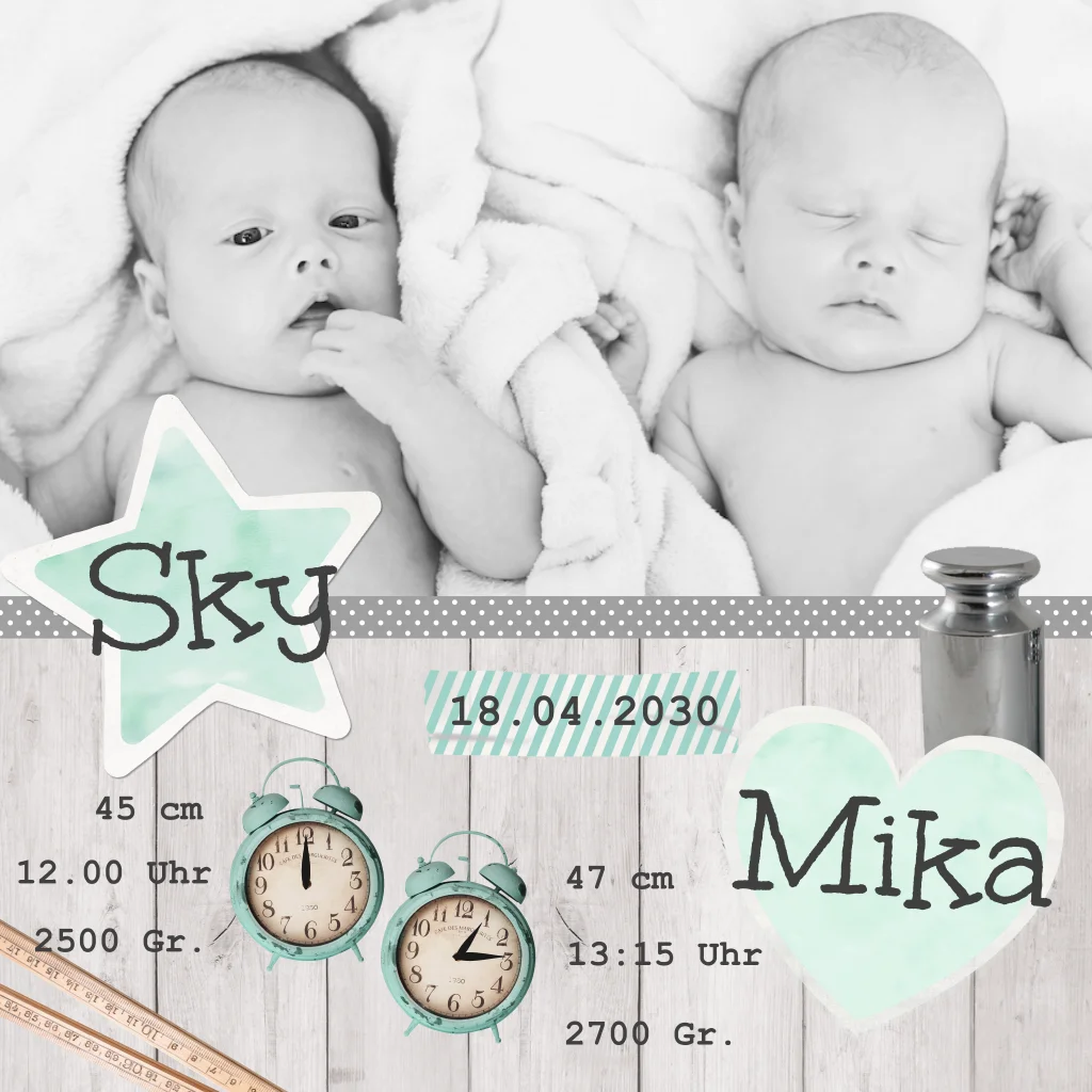 Was für eine hippe Geburtsanzeige für Zwillinge! Der robuste Holzhintergrund und das Foto sind echt schön. Mit den originellen Uhren für die Geburtszeit und dem Stern und dem Herzen für den Namen bekommt die Karte einen verspielten Touch. Ergänze mit eigenen Texten und Fotos.