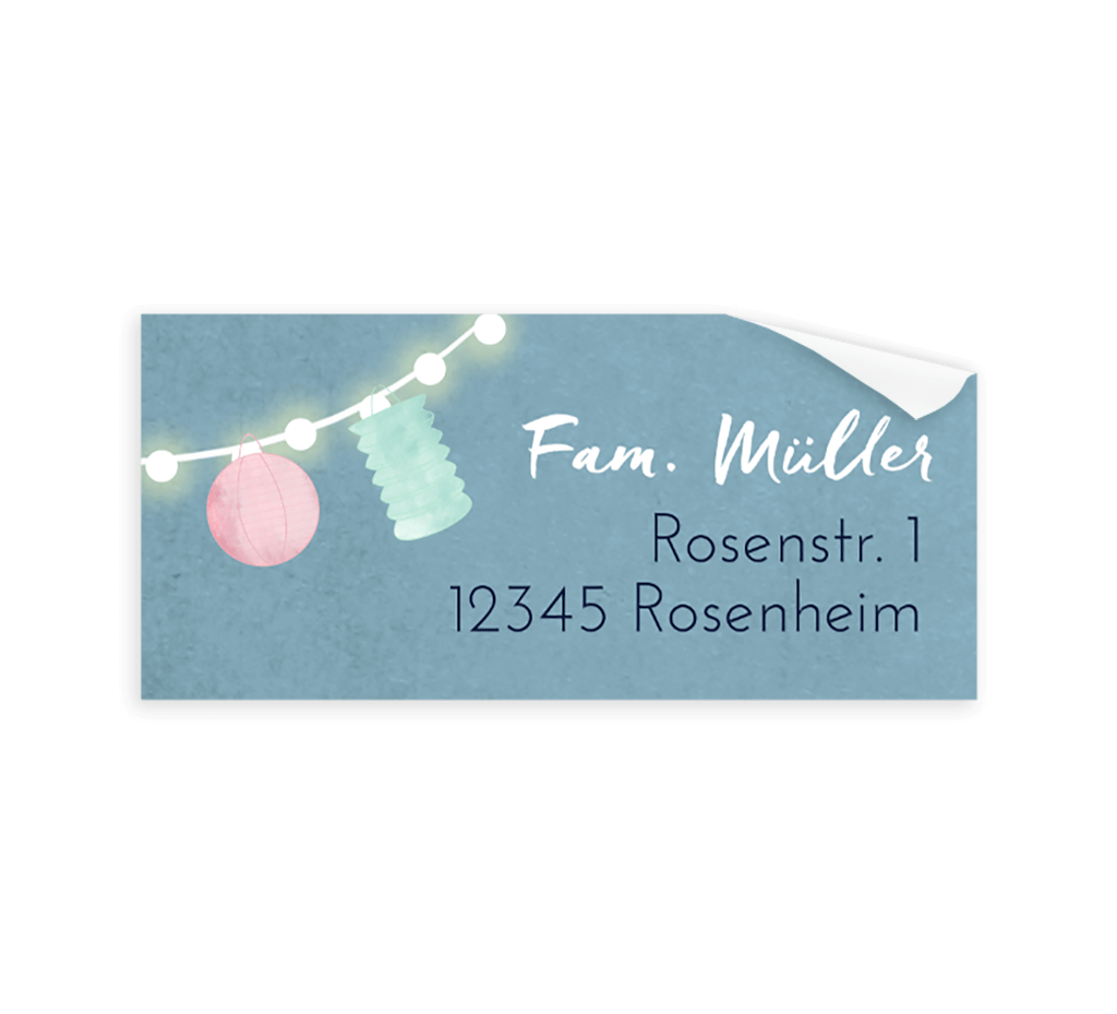 Adressaufkleber mit blauem Hintergrund und Lichterkette