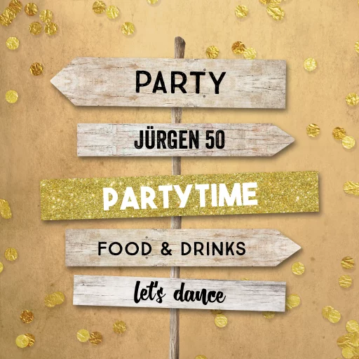 Willkommensschild zum 50 mit Wegweiser und Konfetti