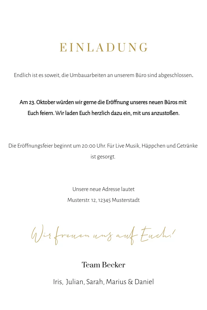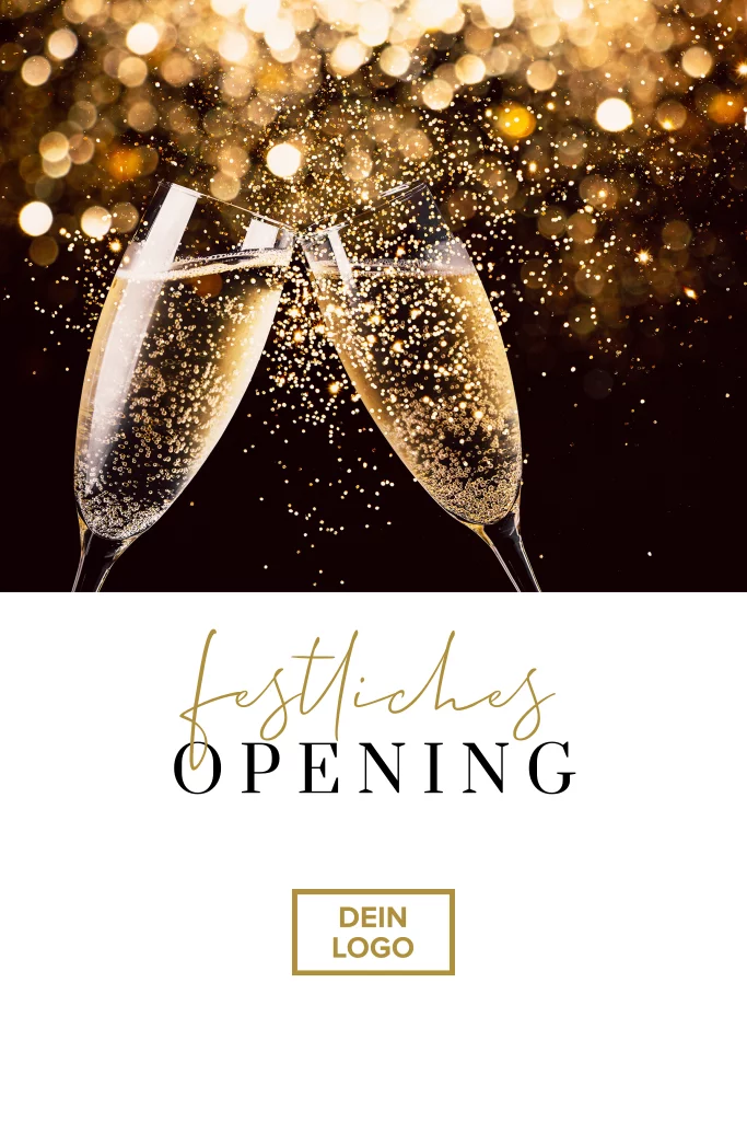 Geschäftliche EInladung zur Eröffnung mit Sektgläsern und Firmenlogo
