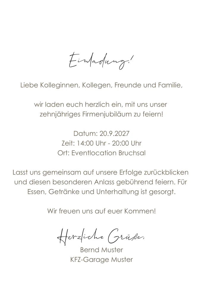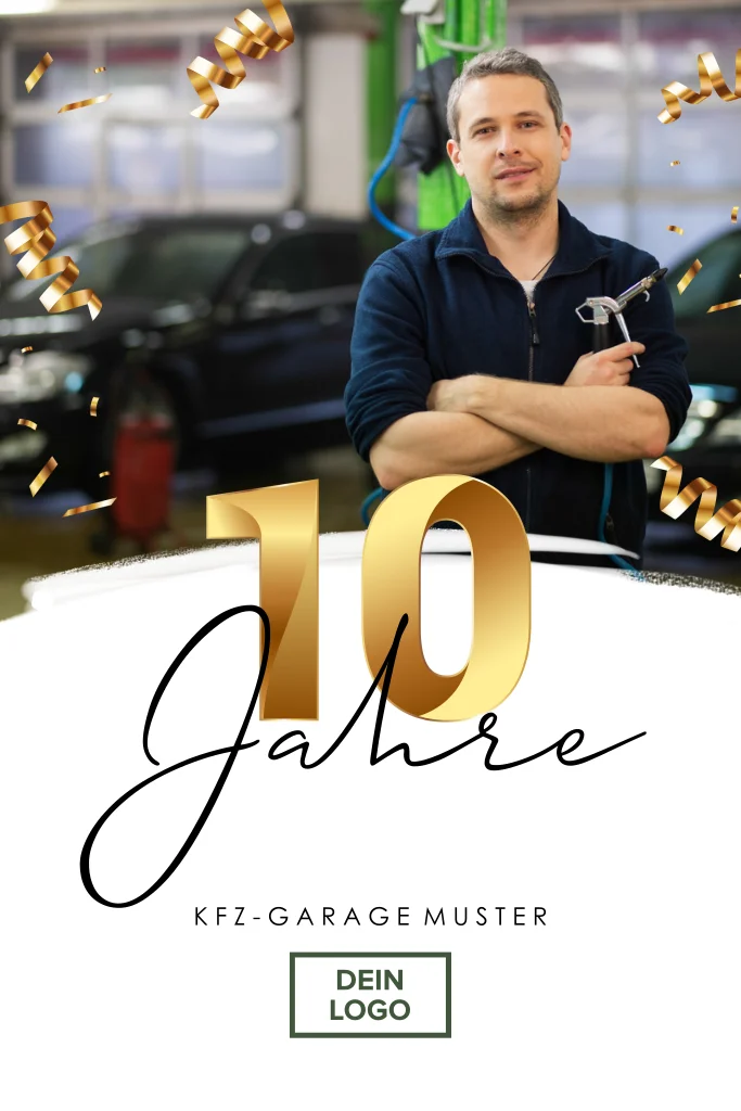 Einladung zum Zehnjährigen Firmenjubiläum KFZ Garage mit Logo