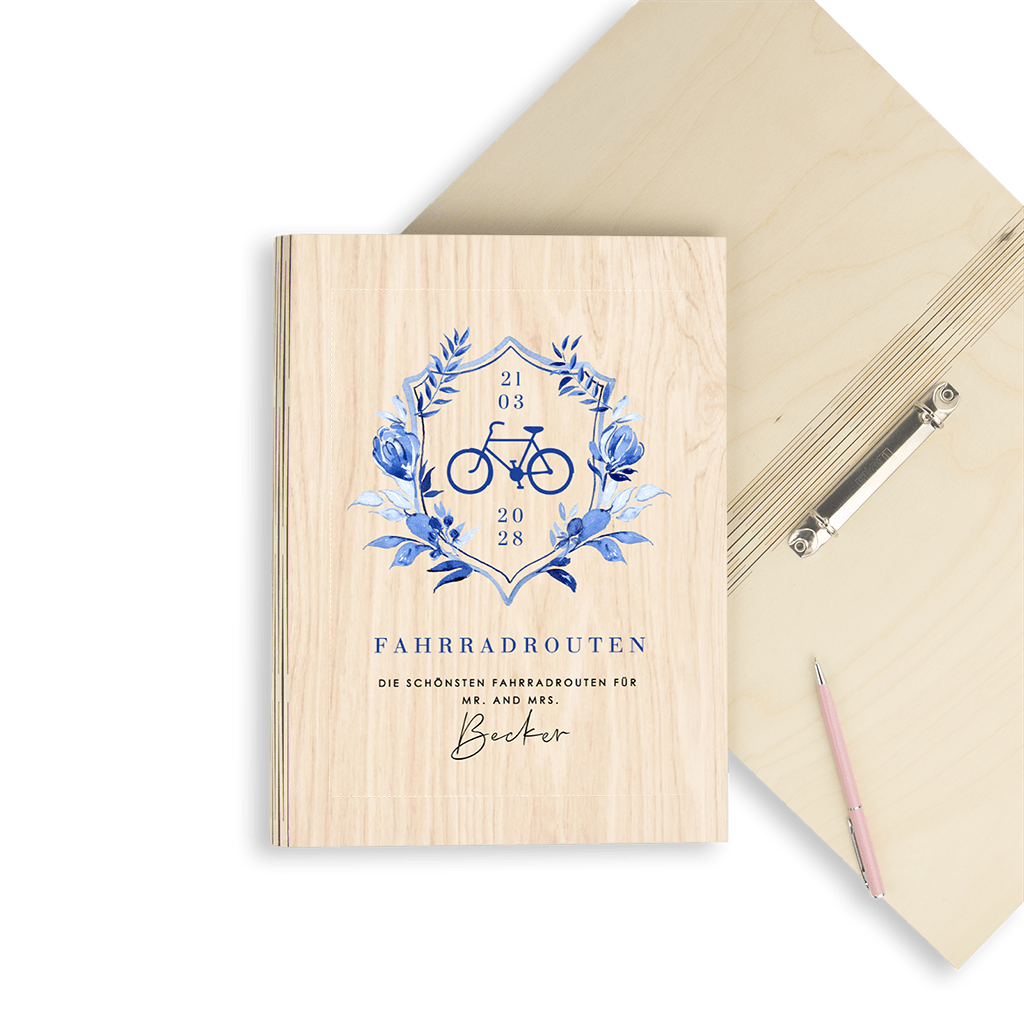 Romantischer Sammelordner für Fahrradrouten zur Hochzeit in Delft Blau
