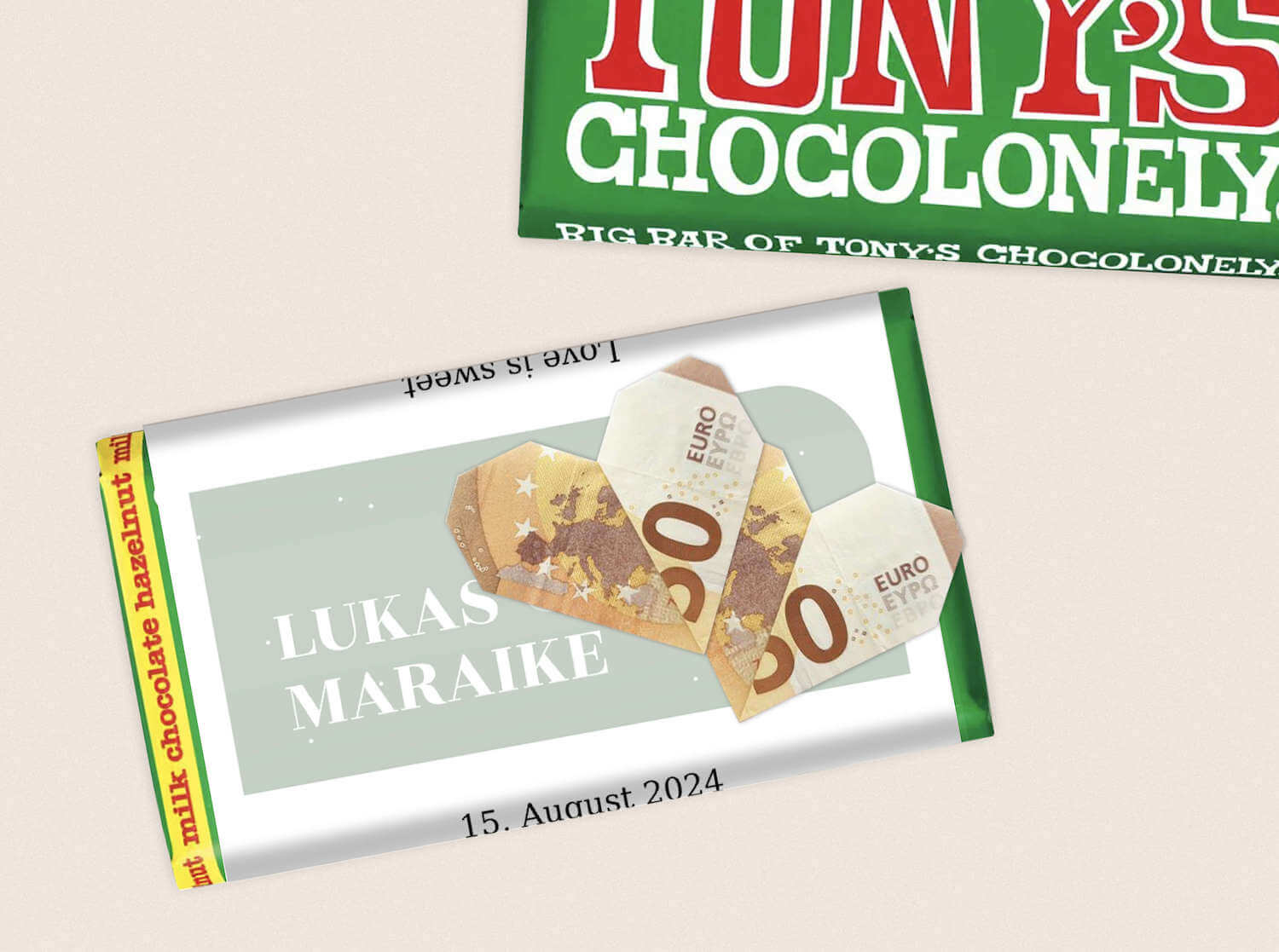 • Wenn du die Schokolade direkt als Geschenk an jemanden zustellen lässt, dann vergiss nicht, deinen eigenen Namen im Design unterzubringen.