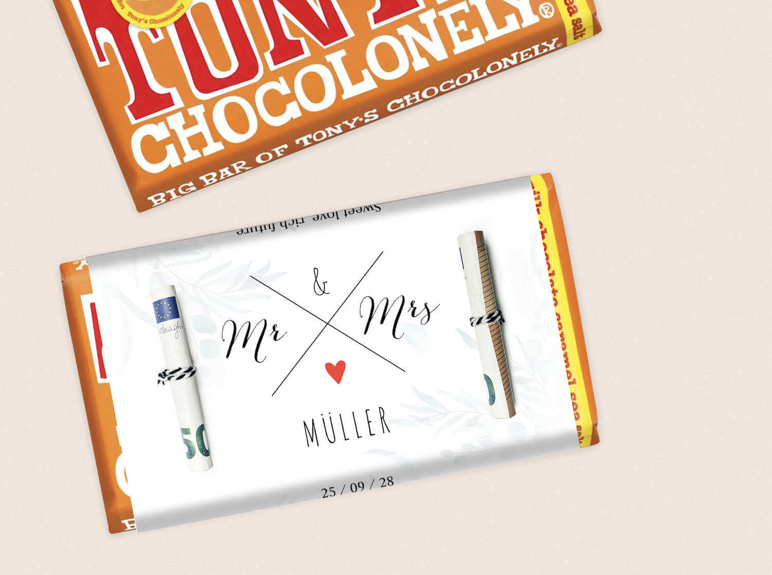 • Die Schokolade bleibt originalverpackt und wird mit dem personalisierten Design umwickelt