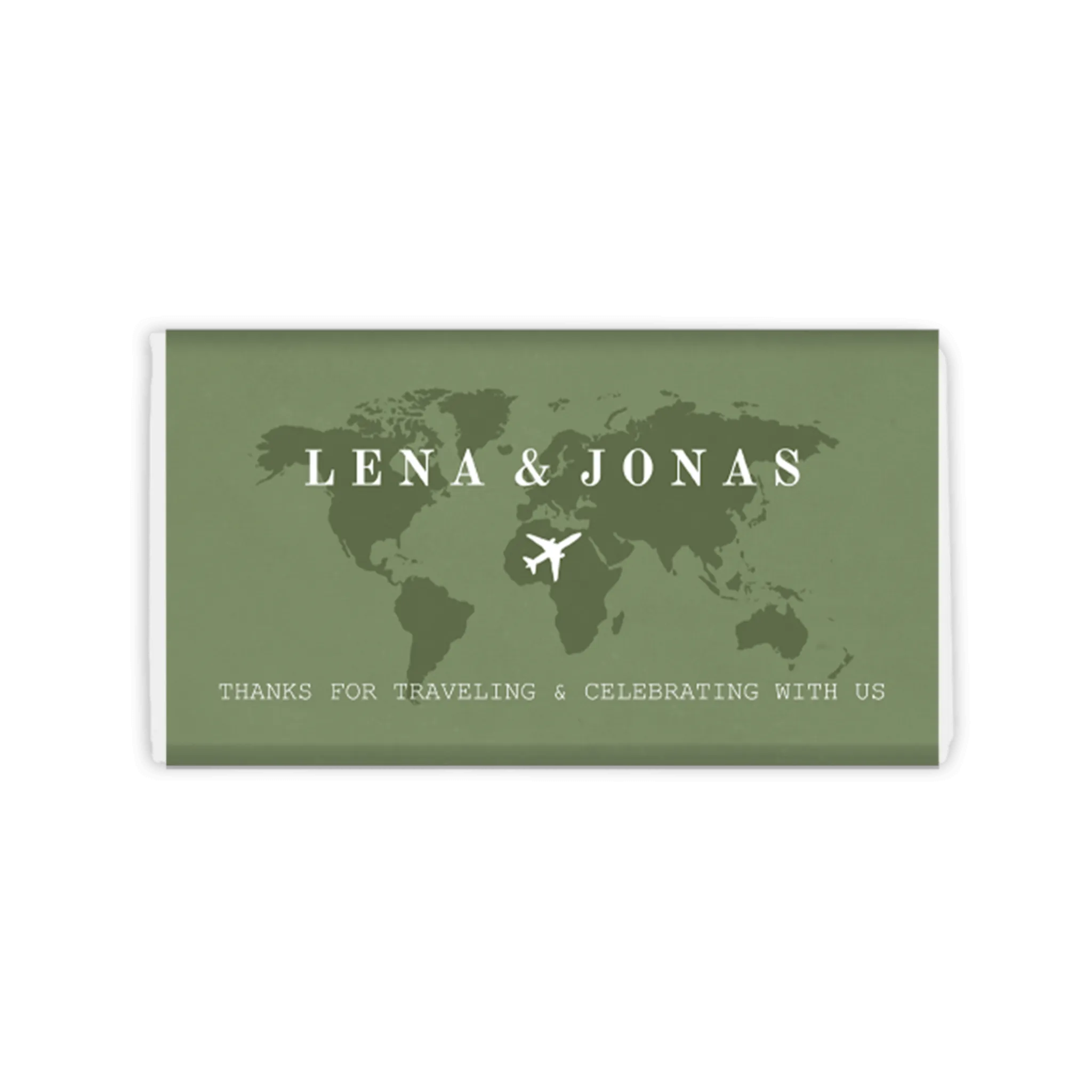 Personalisierte Schokoladenverpackung als Danksagung mit Weltkarte