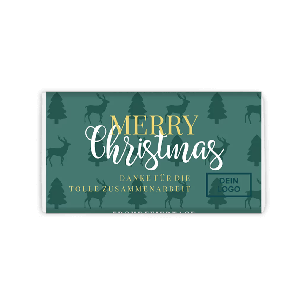 Schokoladenverpackung als Weihnachtsgeschenk mit Tannen und Rehen