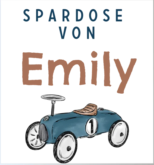 Spardose aus Keramik mit Namen des Kindes und Auto Motiv