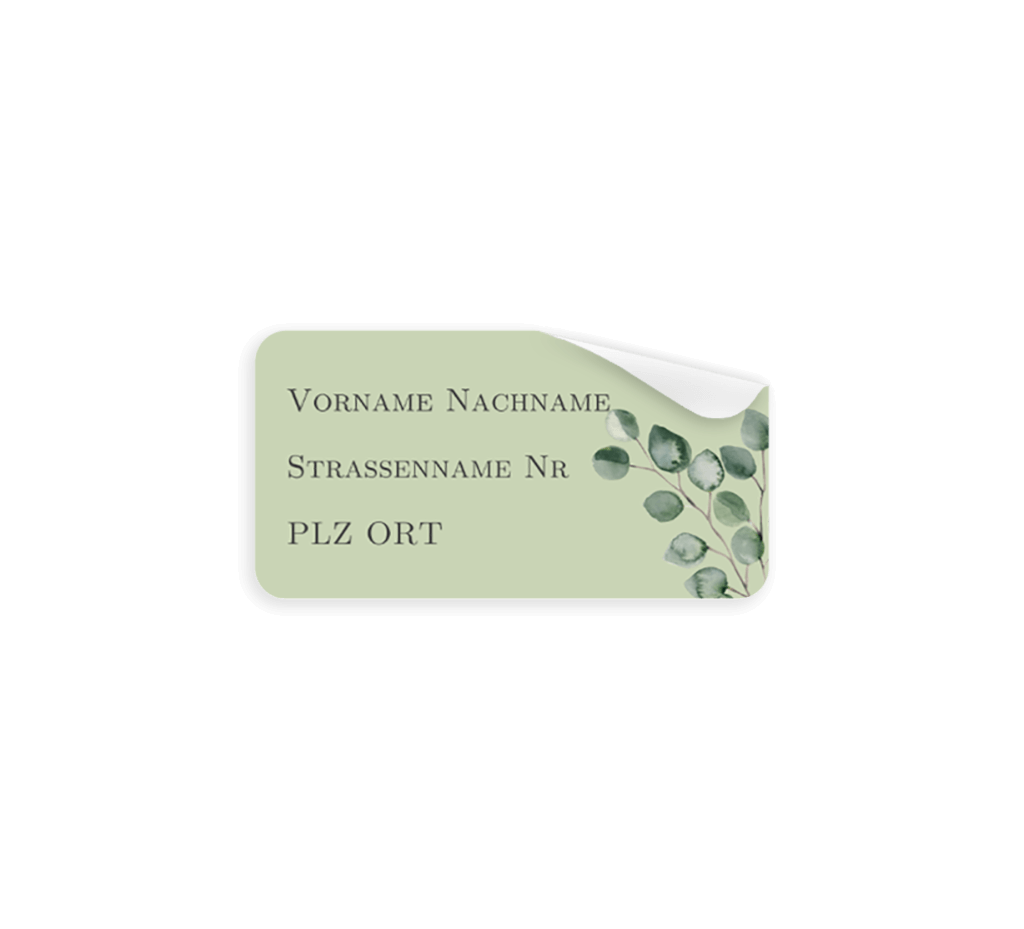 Adressaufkleber mit Eukalyptus Zweigen 97x45mm 12 StückMelde dich für unseren Newsletter an und profitiere von exklusiven Angeboten, kreativen Ideen und Neuigkeiten aus unserer Produktwelt. Als Dankeschön für deine Anmeldung schenken wir dir einen kostenlosen Probedruck deiner Karte.