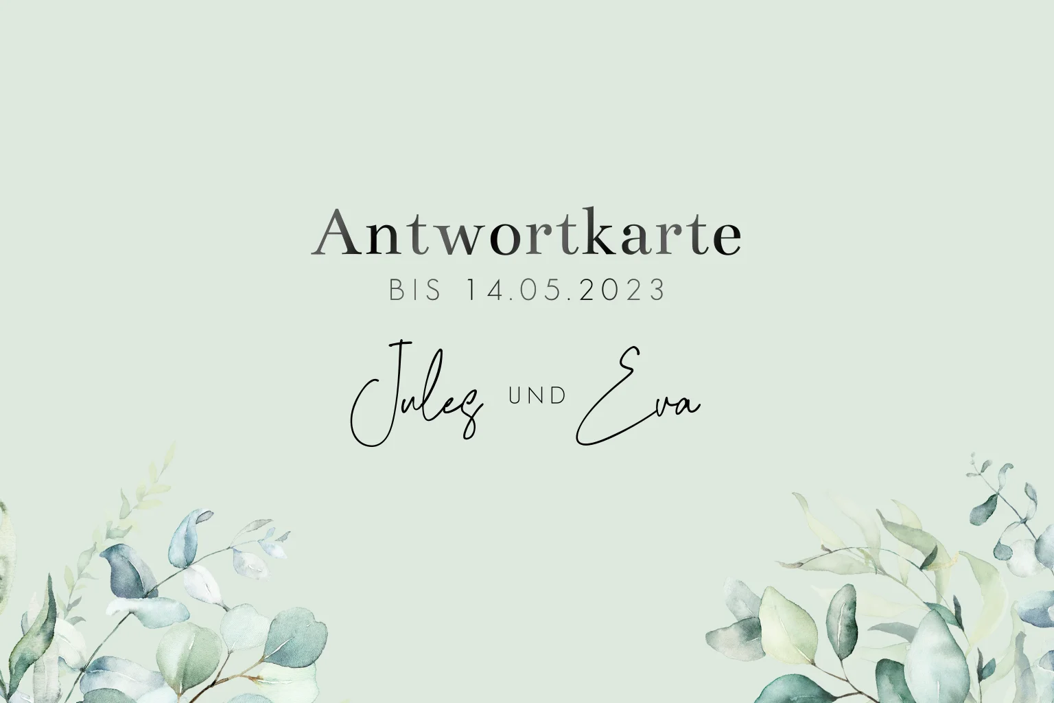 Wunderschöne RSVP zur Hochzeit. Im eleganten Stil mit grünem Hintergrund, blättern und Zweigen. Auf der Vorderseite die Namen de Hochzeitspaares und das Datum bis wann Sie die Antwortkarte zurück erwarten. Auf der Rückseite sind schon ein paar Beispielsätze vorgegeben.Hast du schon die dazu passende Save the date Karte, Hochzeitskarte, Menükarte und Dankeskarte gesehen?