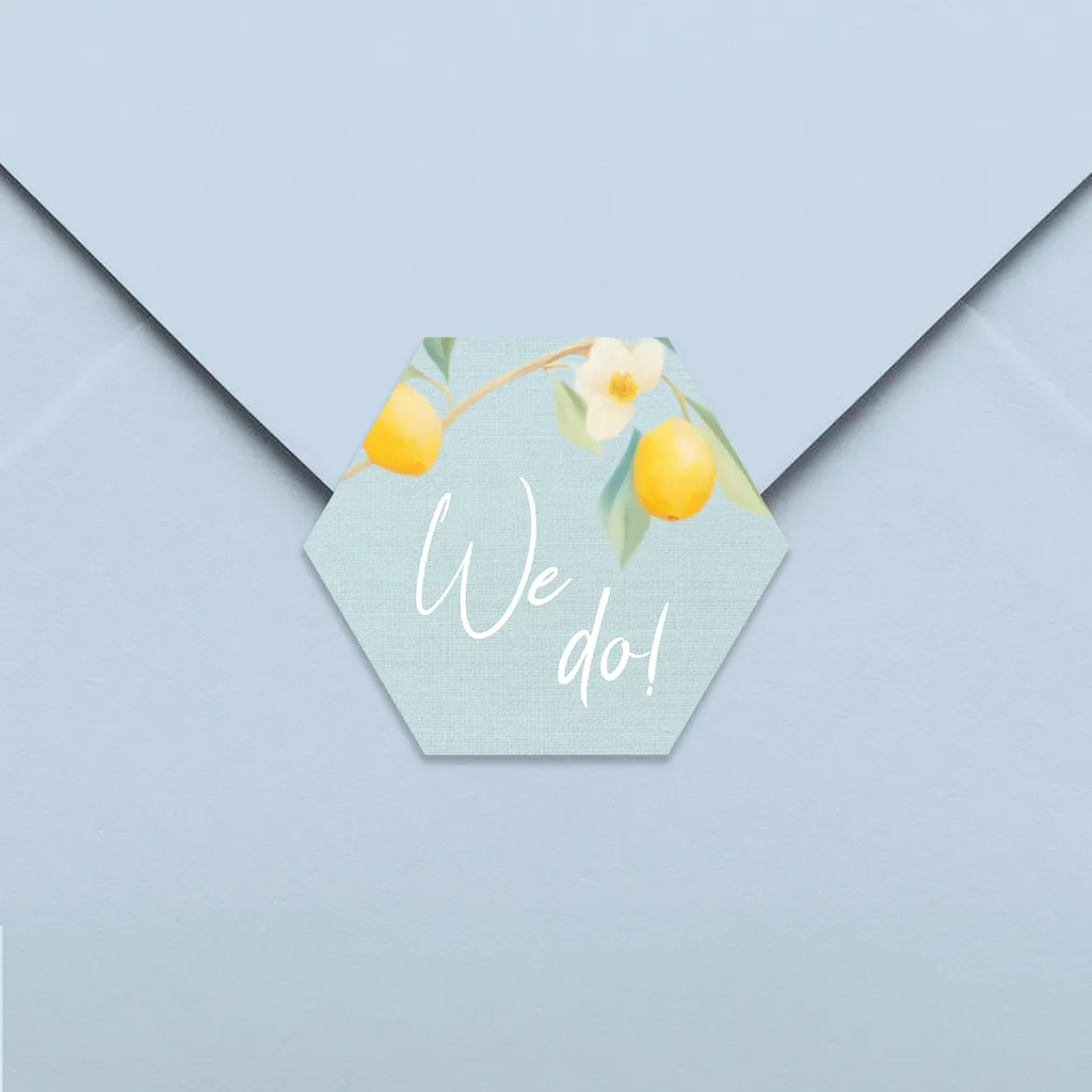 Blauer mediterraner Aufkleber mit Zitronen Hexagon 35x30mm 30 Stück