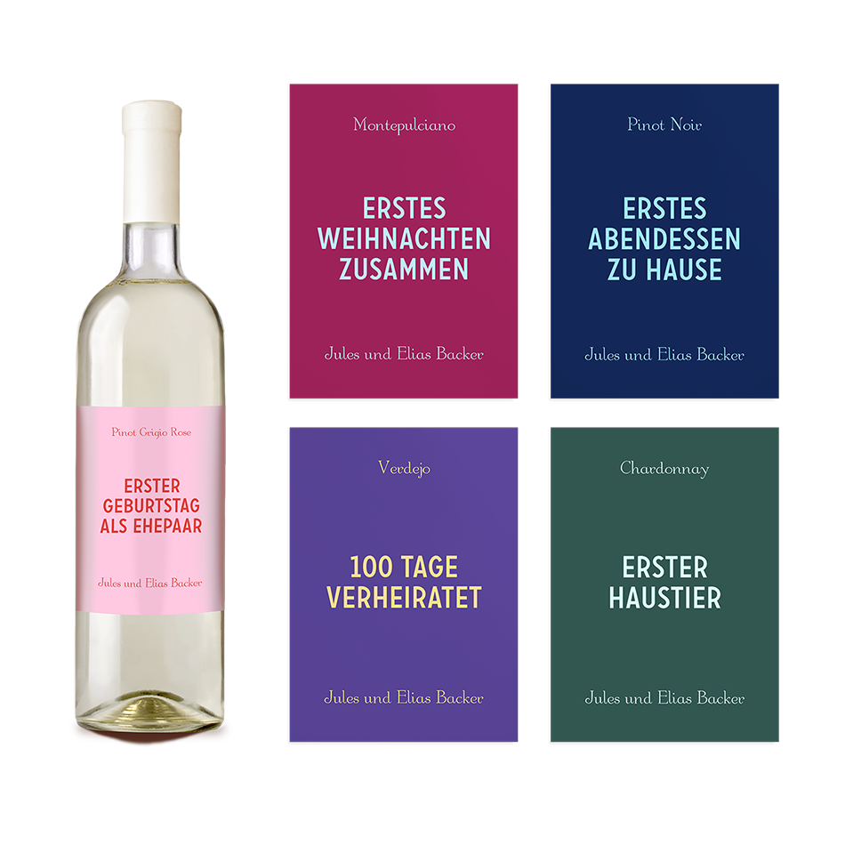 Was für ein originelles Geschenk für eine Hochzeit! 5 einzigartige Weinetiketten für 5 Meilensteine des Brautpaares.