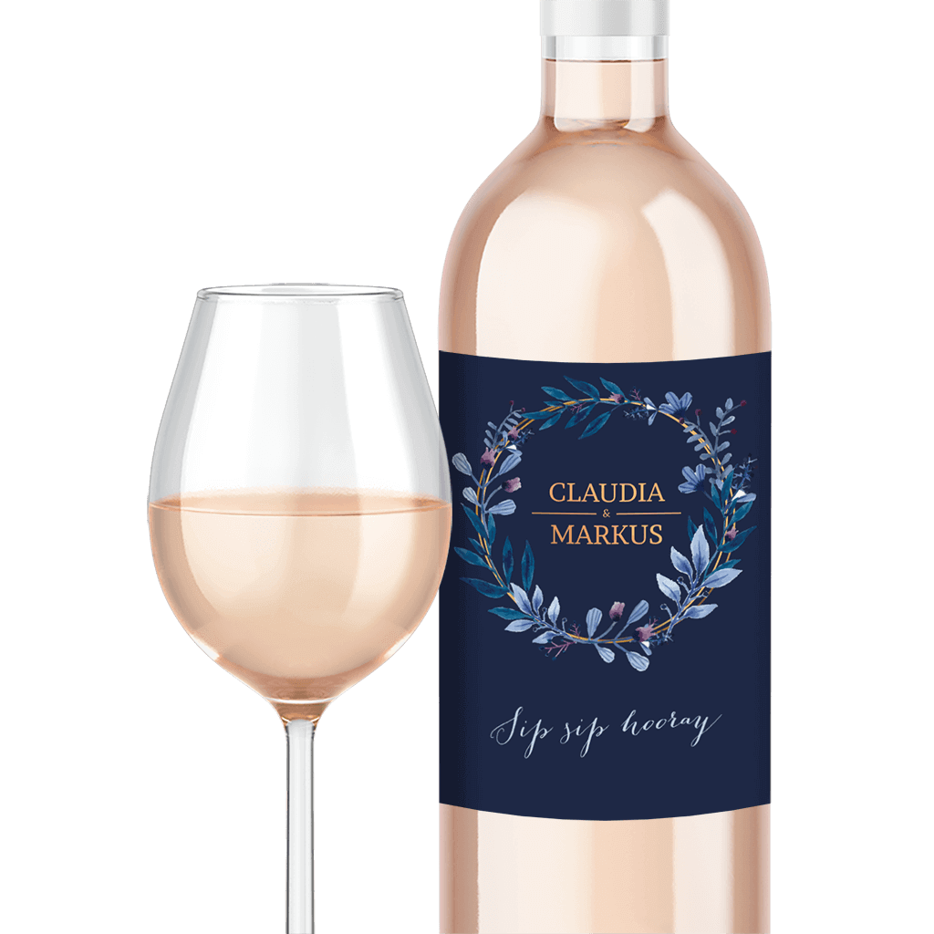 Flaschenetikett mit Blumenkranz in blau. Du erhältst einen Bogen mit fünfFlaschenetiketten in deinem Design, Format 80x110mm.Melde dich für unseren Newsletter an und profitiere von exklusiven Angeboten, kreativen Ideen und Neuigkeiten aus unserer Produktwelt. Als Dankeschön für deine Anmeldung schenken wir dir einen kostenlosen Probedruck deiner Karte.