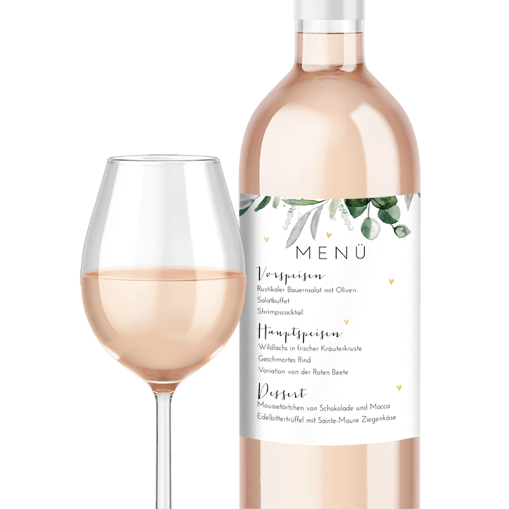 Menü Aufkleber Eukalyptus. Du erhältst einen Bogen mit vier Flaschenetiketten in deinem Design, Format 90 x 120mm.