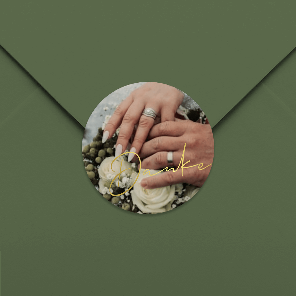 Runder Dankesaufkleber mit Bild und Goldfolienschrift
