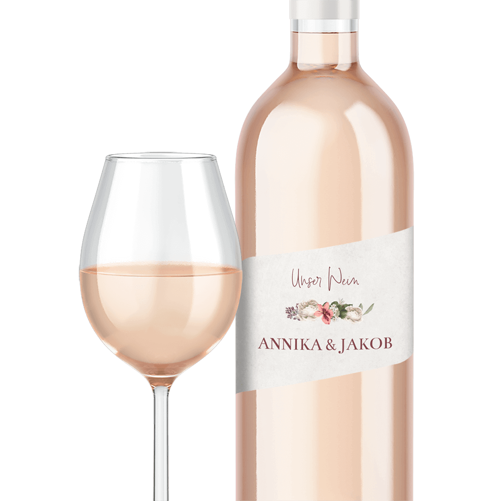 Vintage Flaschenetikett mit Blumen. Du erhältst einen Bogen mit fünf Flaschenetiketten in deinem Design, Format 80x110mm. Möchtet ihr personalisierte Flaschen auf eurer Hochzeit? Flaschenetiketten hier ganz einfach selbst gestalten! Entwirf deine Etiketten selbst und überrasche deine Hochzeitsgäste mit ganz persönlichen Wein-, Sekt- oder Bierflaschen!Melde dich für unseren Newsletter an und entdecke exklusive Angebote, kreative Inspirationen und spannende Neuigkeiten aus unserer Produktwelt. Als Dankeschön erhältst du 5 € Rabatt auf deine nächste Bestellung.