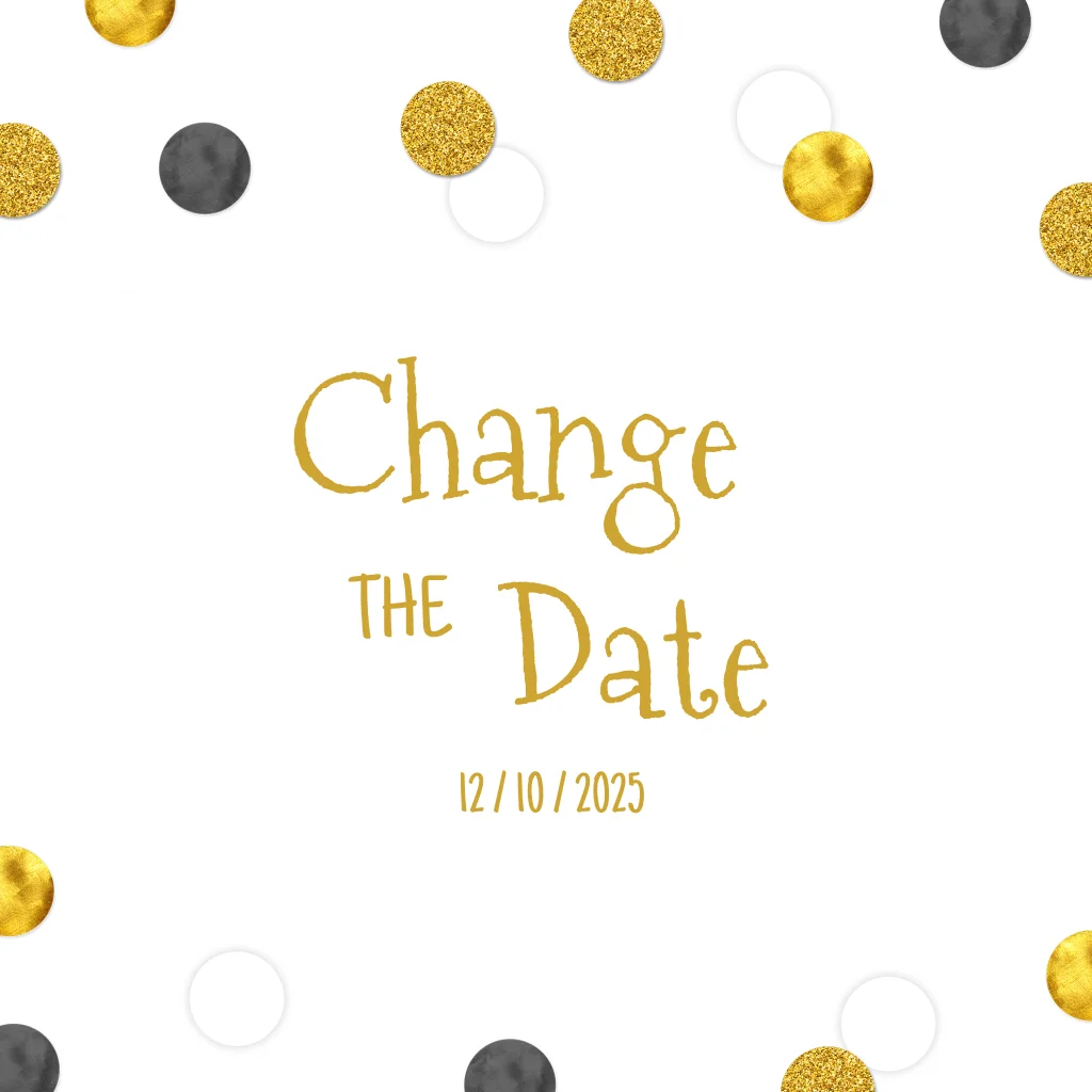 Eine stilvolle "Change the Date"-Karte mit goldfarbenen Punkten, Herz und Buchstaben auf weißem Hintergrund. Lassen Sie Ihre Gäste wissen, dass die Hochzeit auf ein anderes Datum verschoben wird.