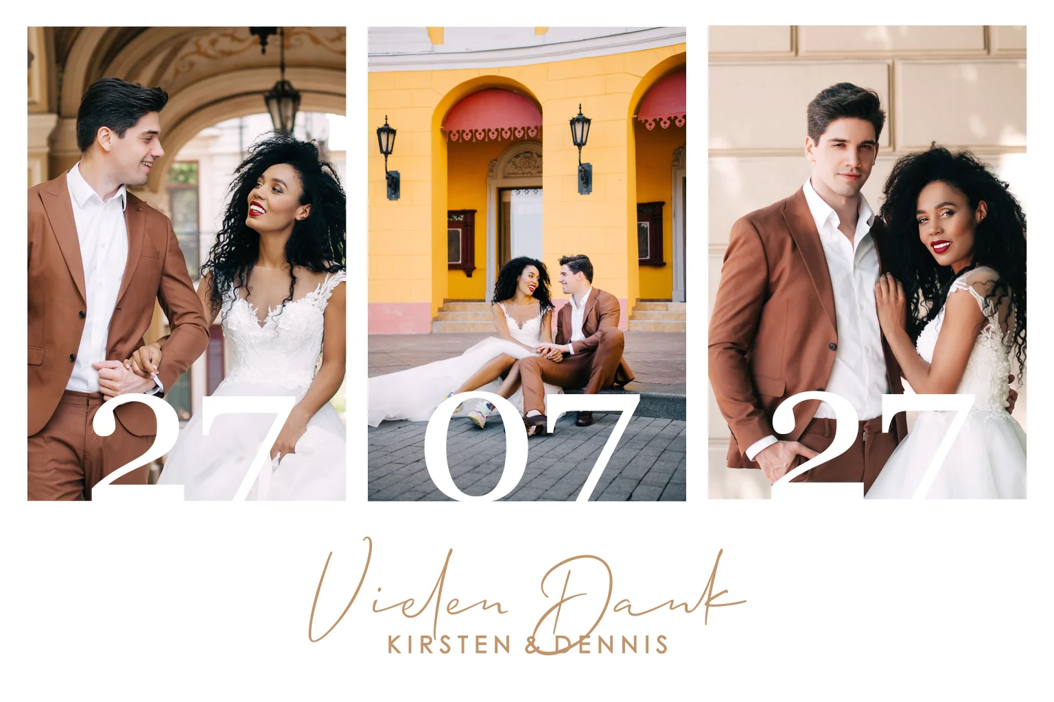 Dankeskarte mit drei FotosDas Design der von dir gewählten Karte wurde automatisch in andere Formate umgestellt. Wähle einfach deinen Wunschformat aus und platziere alle Texte und Elemente an der richtigen Stelle im Editor. Du hast Fragen oder dein Favorit steht nicht zur Auswahl? Dann kontaktiere uns bitte und wir werden uns gemeinsam darum kümmern!