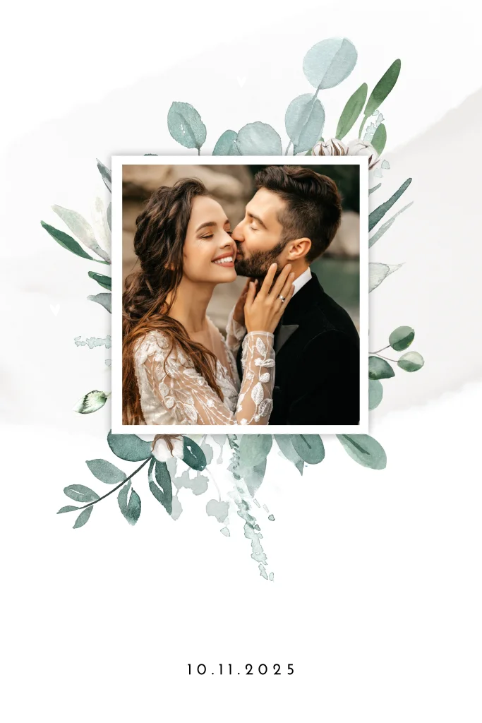 Weiße Danksagungskarte im Stil von Modern Eucalyptus. Euer Foto mit weißem Rand ist umgeben von graugrünen Zweigen. Diese sieht man auch in den Ecken der Rückseite.Sieh dir auch die dazugehörige Save the date Karte, Hochzeitskarte und Menükarte an.