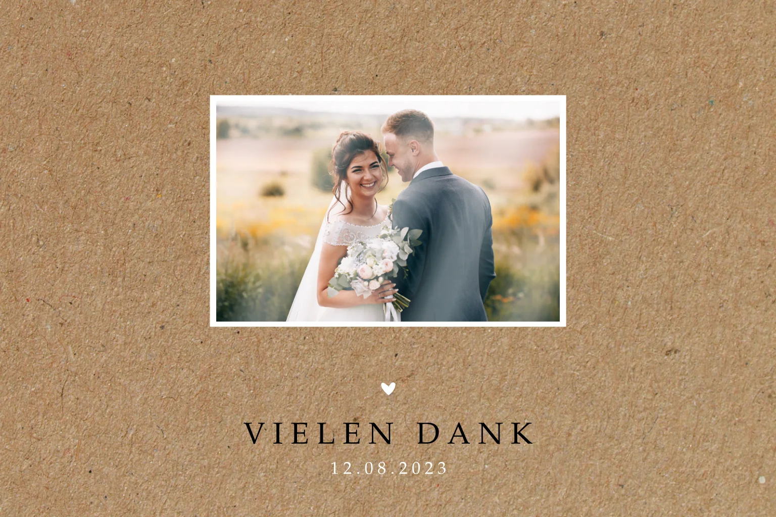 Mit einer Dankeskarte sprecht ihr eure Verbundenheit darüber aus, dass eure Liebsten euch an diesem Tag begleitet haben. Durch das Foto im weißen Rahmen und dem zierlichen weißen Herzchen auf natürlichem Kraftpapier hat die Karte eine starke und charmante Ausstrahlung.Melde dich für unseren Newsletter an und profitiere von exklusiven Angeboten, kreativen Ideen und Neuigkeiten aus unserer Produktwelt. Als Dankeschön für deine Anmeldung schenken wir dir einen kostenlosen Probedruck deiner Karte.