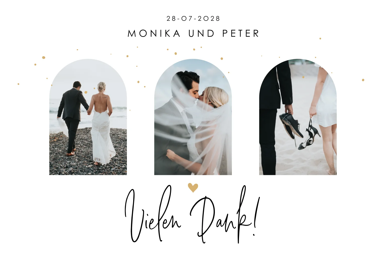 Dankeskarte Hochzeit mit drei Foto's in bogenform