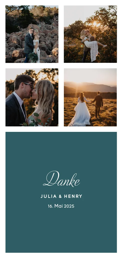 Dankeskarte mit graublauen Farbflächen und Fotos.Das Design der von dir gewählten Karte wurde automatisch in andere Formate umgestellt. Wähle einfach deinen Wunschformat aus und platziere alle Texte und Elemente an der richtigen Stelle im Editor. Du hast Fragen oder dein Favorit steht nicht zur Auswahl? Dann kontaktiere uns bitte und wir werden uns gemeinsam darum kümmern!
