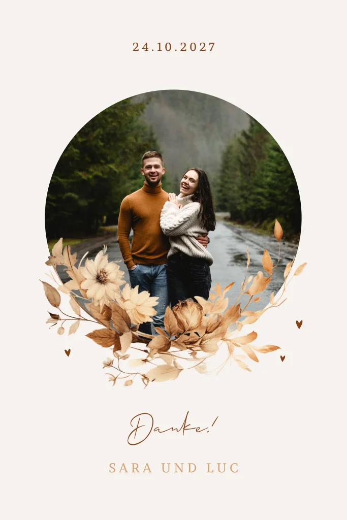 Dankeskarte mit kreisfoermigen Foto und Blumenkranz