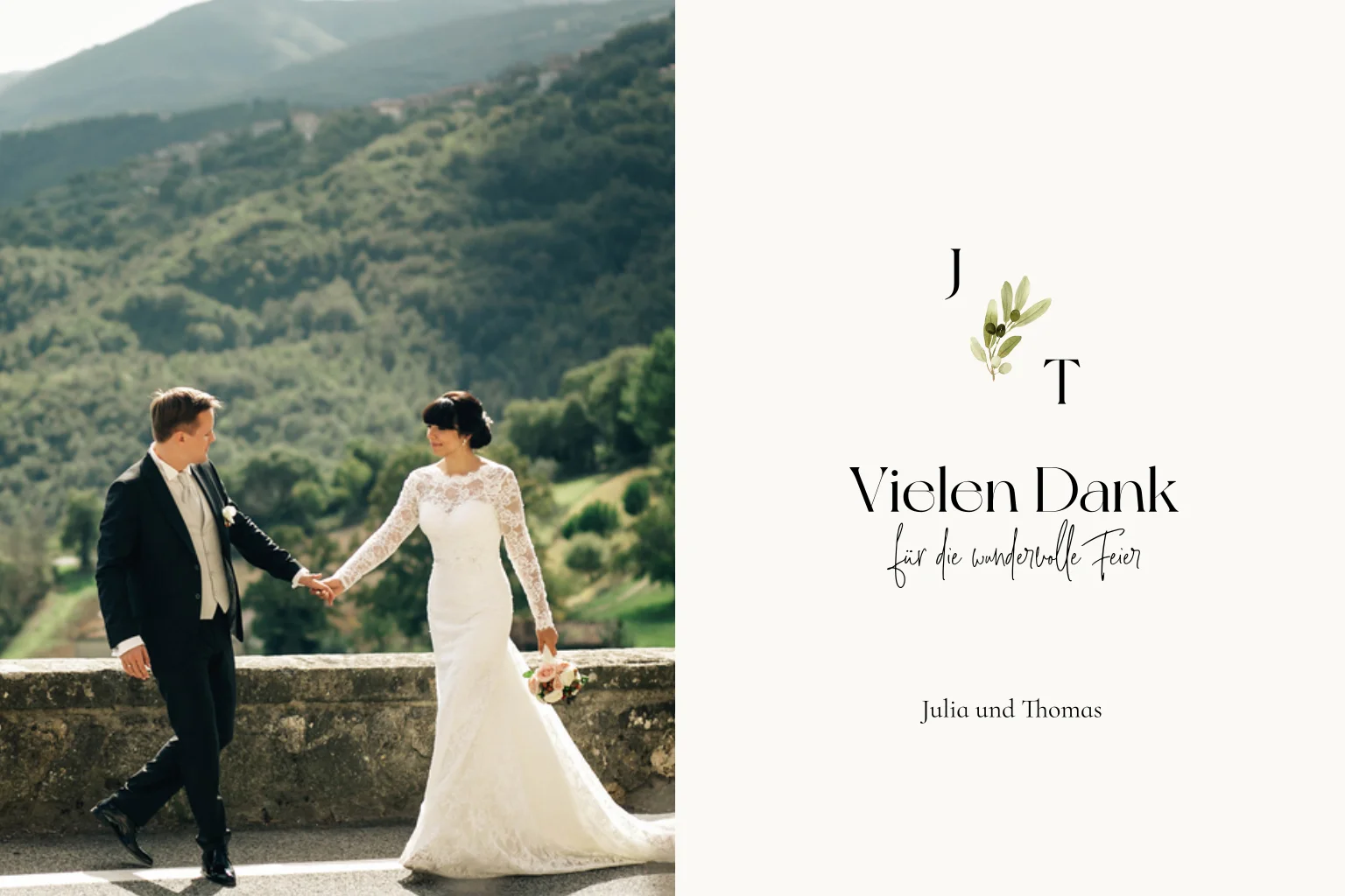 Dankeskarte Hochzeit mit Aquarell-Flair mit Foto und Olivenzweig.