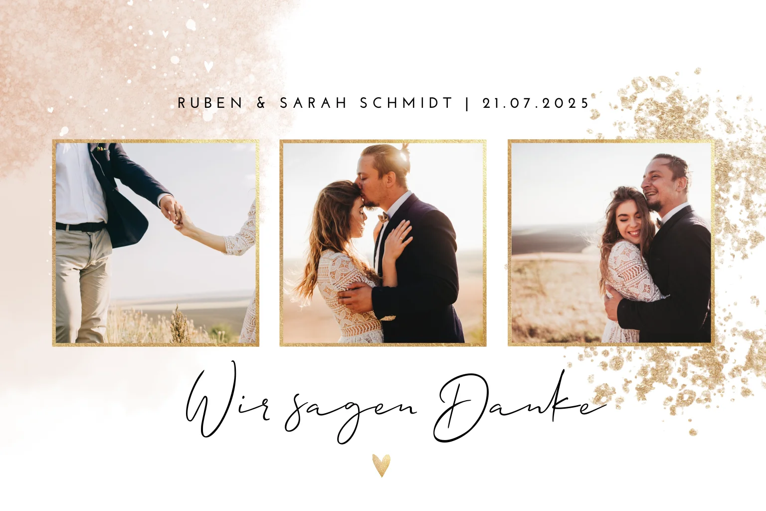 Dankeskarte Hochzeit mit Fotos und Goldflecken