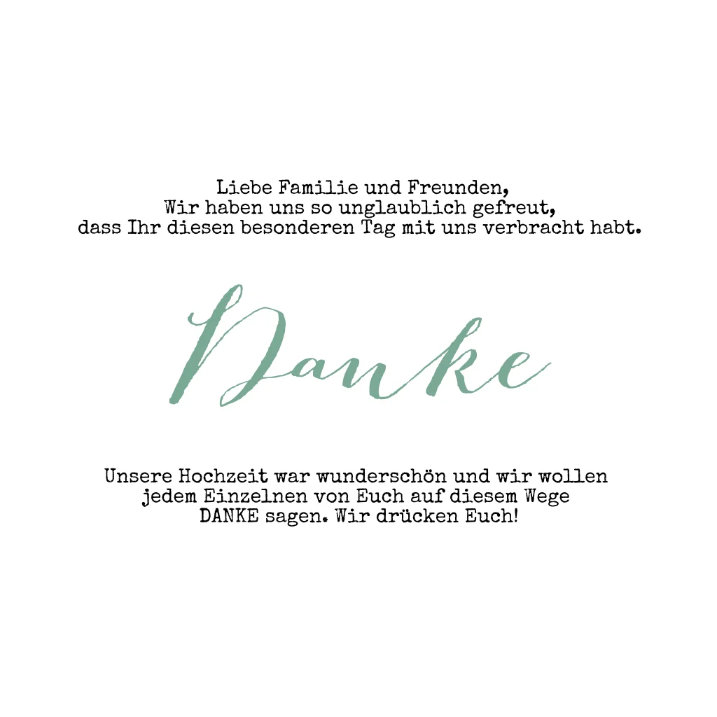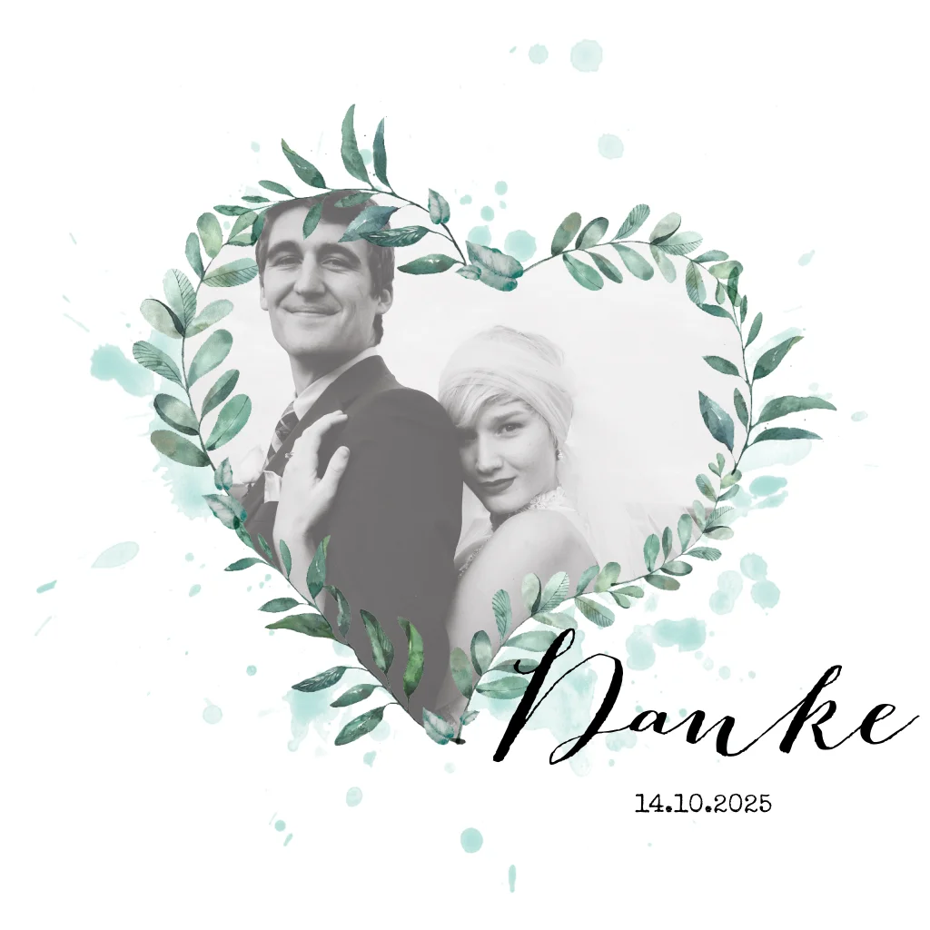 Traumhafte Hochzeitsdanksagung mit herzförmigen Foto und Ranken