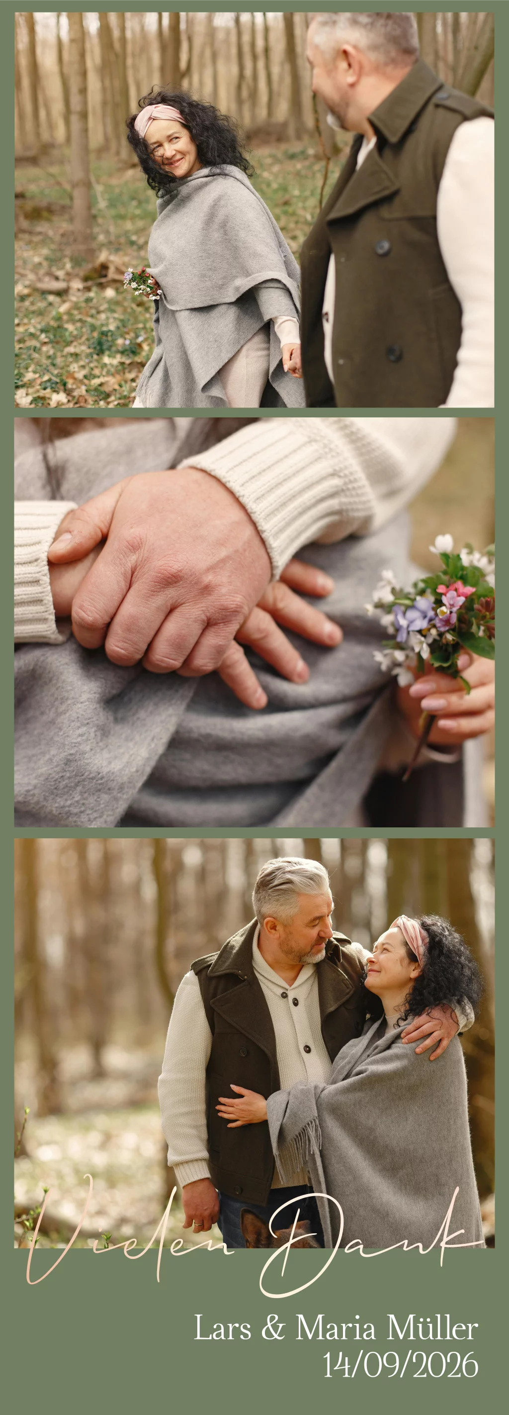 Das Design der von dir gewählten Karte wurde automatisch in andere Formate umgestellt. Wähle einfach deinen Wunschformat aus und platziere alle Texte und Elemente an der richtigen Stelle im Editor. Du hast Fragen oder dein Favorit steht nicht zur Auswahl? Dann kontaktiere uns bitte und wir werden uns gemeinsam darum kümmern!