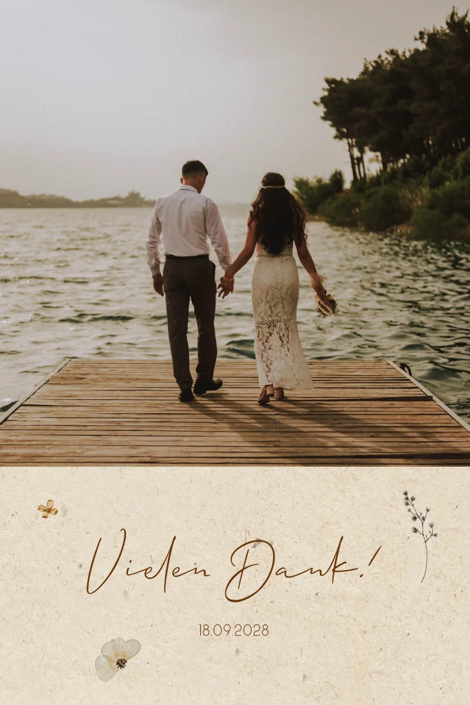 Dankeskarte zur Hochzeit im Öko-Stil mit TrockenblumenDas Design der von dir gewählten Karte wurde automatisch in andere Formate umgestellt. Wähle einfach deinen Wunschformat aus und platziere alle Texte und Elemente an der richtigen Stelle im Editor. Du hast Fragen oder dein Favorit steht nicht zur Auswahl? Dann kontaktiere uns bitte und wir werden uns gemeinsam darum kümmern!