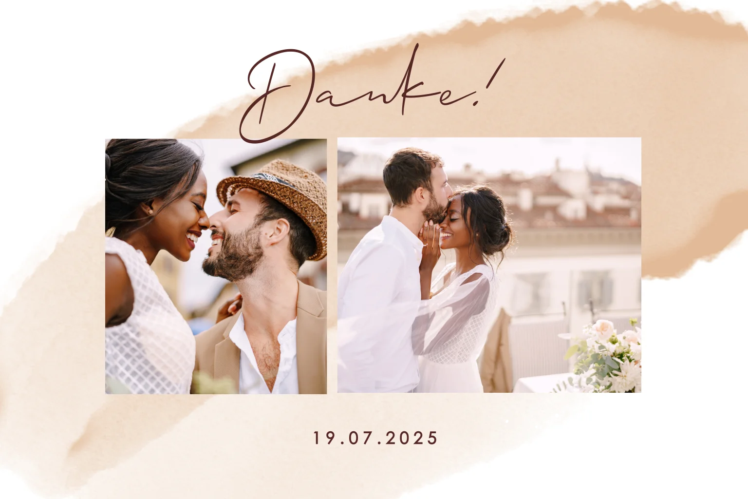 Bedankt euch bei denen, die euch euren perfekten Tag mit möglich gemacht haben mit einer persönlichen Dankeskarte.Das Design der von dir gewählten Karte wurde automatisch in andere Formate umgestellt. Wähle einfach deinen Wunschformat aus und platziere alle Texte und Elemente an der richtigen Stelle im Editor. Du hast Fragen oder dein Favorit steht nicht zur Auswahl? Dann kontaktiere uns bitte und wir werden uns gemeinsam darum kümmern!