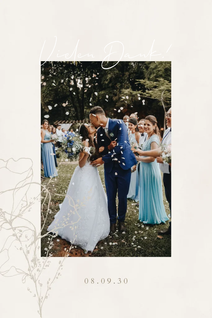 Dankeskarte Hochzeit mit angedeuteten Blumen und eleganter Schrift in RoségoldfolieMelde dich für unseren Newsletter an und profitiere von exklusiven Angeboten, kreativen Ideen und Neuigkeiten aus unserer Produktwelt. Als Dankeschön für deine Anmeldung schenken wir dir einen kostenlosen Probedruck deiner Karte.