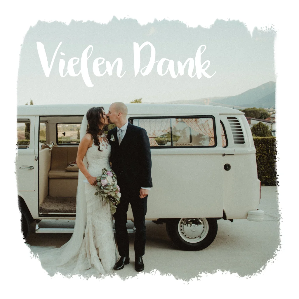 Gestaltet eure einzigartige Hochzeitsdanksagung mit einem schönen Foto von euch und einem ausgefallenem weißen Rahmen. Ihr könnt die Farben, Schriften und Texte thematisch an eure Hochzeit anpassen und euch so bei euren Gästen für euren schönsten Tag bedanken und gleichzeitig Erinnerungen an die Feier wecken.