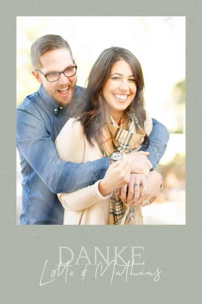 Danksagungskarte zur Rosenhochzeit in zartem Salbeigrün mit großem Foto.