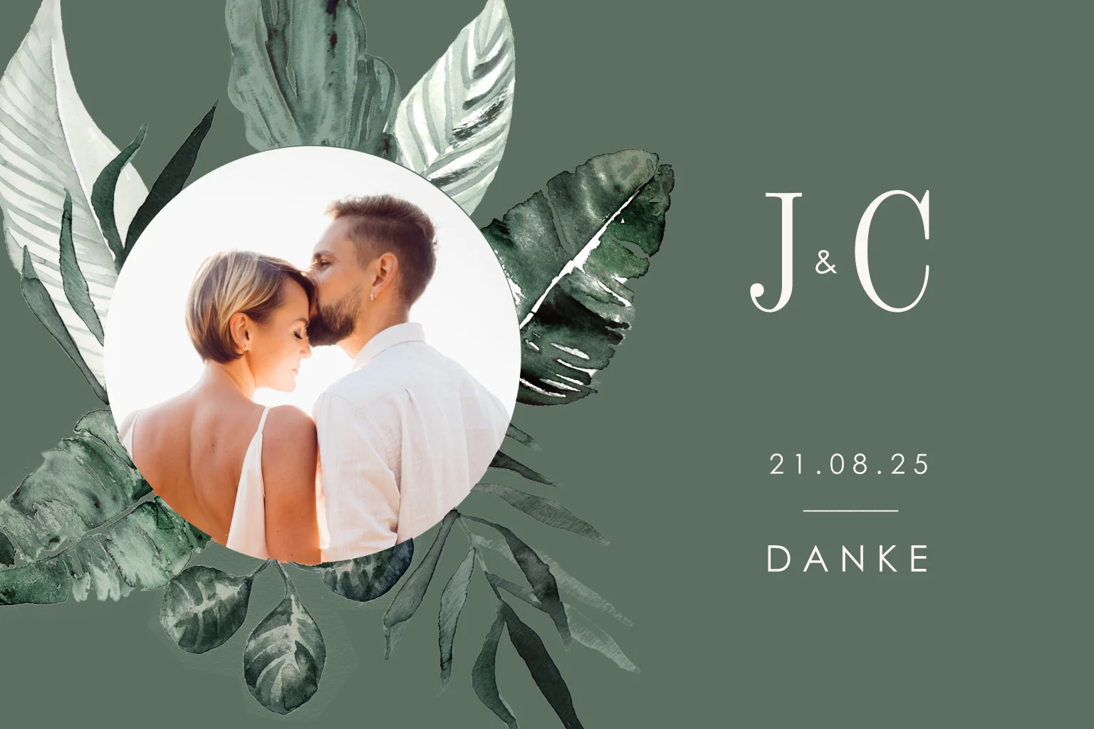 Doppelseitige Dankeskarte zur Hochzeit im Grünton mit Foto und Zweigen.Melde dich für unseren Newsletter an und profitiere von exklusiven Angeboten, kreativen Ideen und Neuigkeiten aus unserer Produktwelt. Als Dankeschön für deine Anmeldung schenken wir dir einen kostenlosen Probedruck deiner Karte.